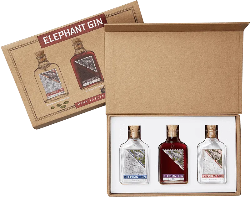 Das Elephant Gin Tasting Set in einer liebevoll gestalteten Tasting-Box, die sich perfekt als Mitbringsel oder Geschenk eignet.