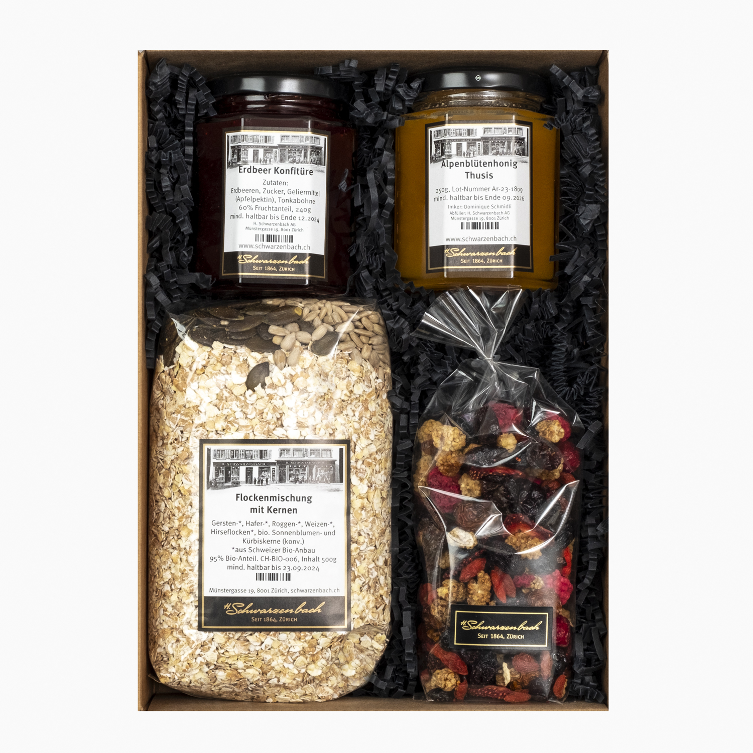 Eine Auswahl an Spezialitäten für ein feines “Z’Morge”, verpackt in einer braunen Geschenkbox: