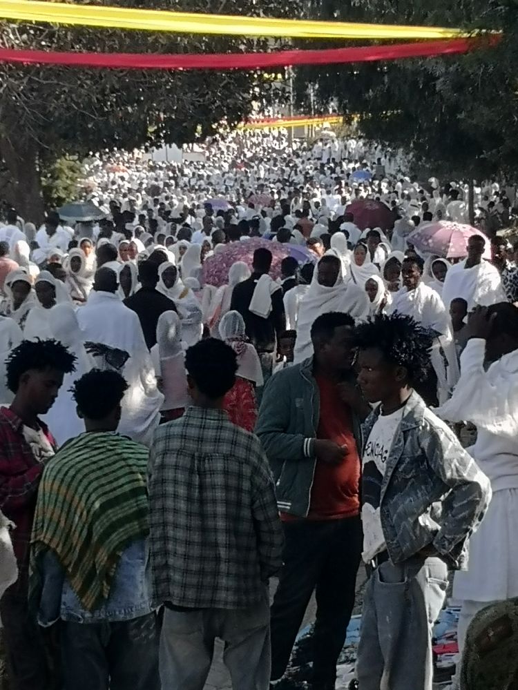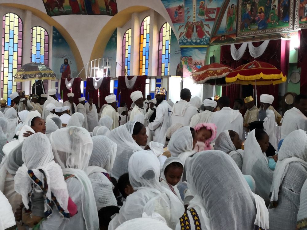 Solche Tücher werden in Äthiopien oft als Schultertuch über einem traditionellen Kleid getragen; in der Kirche sieht man ein „Meer“ aus diese weißen Tüchern