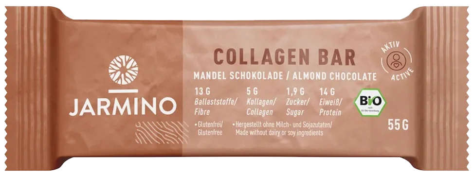 Alle Informationen zu Jarmino Kollagen Riegel Mandel Unser Bio-Kollagenriegel liefert Protein und Kollagen. Erist ein zuckerarmer und ballaststoffreicher Energielieferant, ideal als Snackfür zwischendurch oder beim Sport.Hauptbestandteile sind unser hochwertigesBio Kollagen aus Rinderknochenbrühe, vegane Erbsen- und Reisproteine sowieBallaststoffe aus der Agave.DieserBio-Kollagen-Proteinriegel wurde entwickelt, um den Körper mit reinenNährstoffen und Aminosäuren zu versorgen, die er zum Muskelaufbau und zurRegenration benötigt und die das Hungergefühl stillen.Bei derZusammensetzung der Zutaten haben wir besonders auf die Darmfreundlichkeit undden glykämischen Index geachtet.Fakten pro Riegel (55g):5g Kollagen14g Eiweiß13g BallaststoffeHoher Proteingehalt und toller Geschmack – das zeichnet unsere JARMINO Kollagen-Protein-Riegel aus. Ein Riegel enthält 25% Protein und 100% Geschmack.Qualität die überzeugt100% Bio-Qualität Glutenfrei Ohne Milch- und Sojazutaten Ohne Zuckerzusatz (enthält nur natürlich vorkommenden Zucker) Niedriger glykämischer Index In zwei verschiedenen, leckeren Geschmacksrichtungen (Mandel-Schokolade und Erdnuss-Schokolade) können die Riegel zu jeder Tageszeit konsumiert werden, als Snack zwischendurch oder als Proteinquelle nach dem Training. Unsere Kollagen Riegel haben wir so entwickelt, dass Sie sie ohne schlechtes Gewissen jederzeit konsumieren können.Für was ist der Riegel geeignet?Perfekt für Muskelaufbau und Definition.Als Post-Workout-Snack oder für zwischendurch.Als darmfreundlicher Proteinriegel mit Knochenbrühen-Kollagen.Als sättigenden Snack ohne entzündungsfördernde Zutaten wie Milch und Soja.Super soft, super proteinreich, super lecker – der JARMINO Kollagen Riegel.