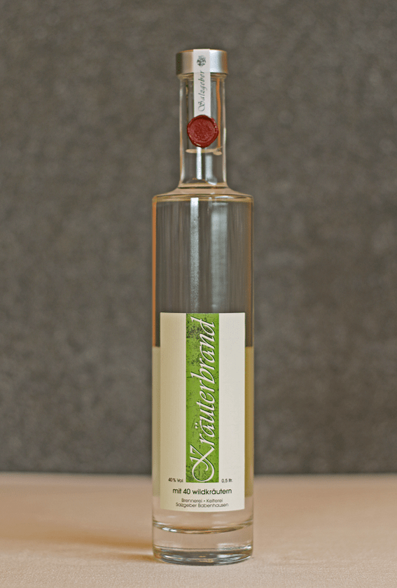 Eine doppelt gebrannte Spezialität. Dafür wird einem Teil der Obstbrand-Maische eine Kräutermischung zugegeben, die auf alten Rezepten beruht. Wenn die Maische die Kräuteraromen aufgenommen hat, wird sie sehr schonend ein erstes Mal destilliert. Dieser sog. Rohbrand wird dann ein zweites Mal langsam abgetrieben, dabei wird der Vor- und Nachlauf großzügig abgeschieden. Beim zweiten Brennvorgang erst vermählen sich Geschmacks- und Duftkomponenten der Kräuter mit den fruchtigen Aromen der Äpfel und Birnen eine wohlausgewogene Köstlichkeit entsteht. Um ihren vollen Aromareichtum entfalten zu können, ruht sie vor der Abfüllung einige Monate in Glasballons. Eine Wohltat für Gaumen und Magen …