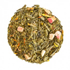 Zutaten: Sencha Grüntee, Sonnenblumenblüten, Rhabarberstückchen, Saflorblüten, Aroma.