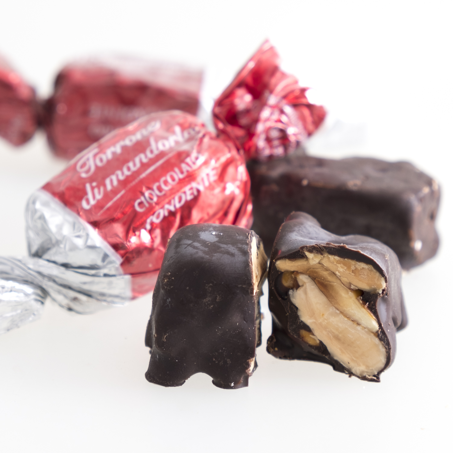 Exquisite geröstete und karamellisierte Mandeln, umhüllt mit dunkler Schokolade. Zusammen mit einem Espresso, einfach ein Genuss.